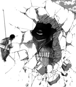 In sintesi veniamo a sapere che gli esseri umani, per proteggersi da questi misteriosi giganti, si sono rinchiusi dentro città dalle alte fortificazioni di cui sembra sia rimasta intatta in tutto il mondo solo quella descritta da Isayama. Quest’ultima è strutturata in tre fortificazioni concentriche di cui la più esterna viene improvvisamente attaccata da un gigante comparso dal nulla e sovrastante le mura stesse. È lui che apre la breccia che consentirà ai suoi simili di entrare costringendo la popolazione a ripiegare nella seconda cinta muraria.