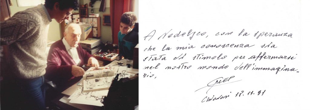Ma il 1992 fu un anno fondamentale della mia vita: dopo circa quattro mesi dall’ultima visita ad Aurelio Galleppini, incontrai il mio idolo di sempre, Jacovitti e con lui diedi inizio una collaborazione lunga quasi cinque anni.