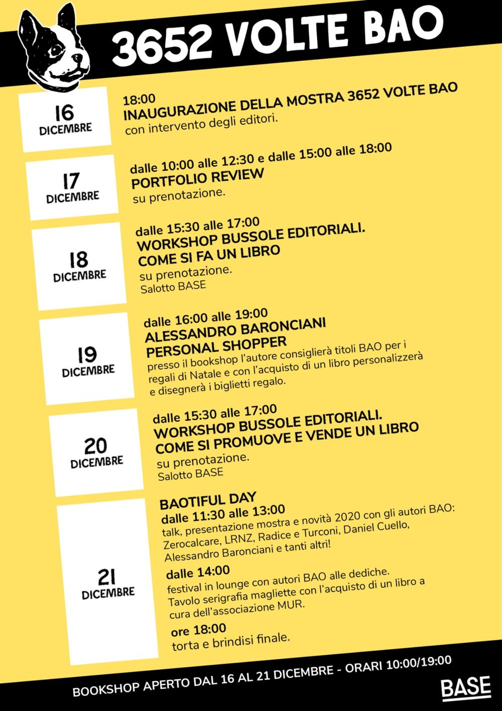 BAO Publishing è lieta di festeggiare i suoi primi 10 anni. Il 21 dicembre infatti è il compleanno della casa editrice che sarà celebrato con una settimana di eventi speciali a Milano dal 16 al 21 dicembre. L’appuntamento, a ingresso libero, si intitola 3652 volte BAO ed è realizzato in collaborazione con BASE Milano, in via Bergognone 34.