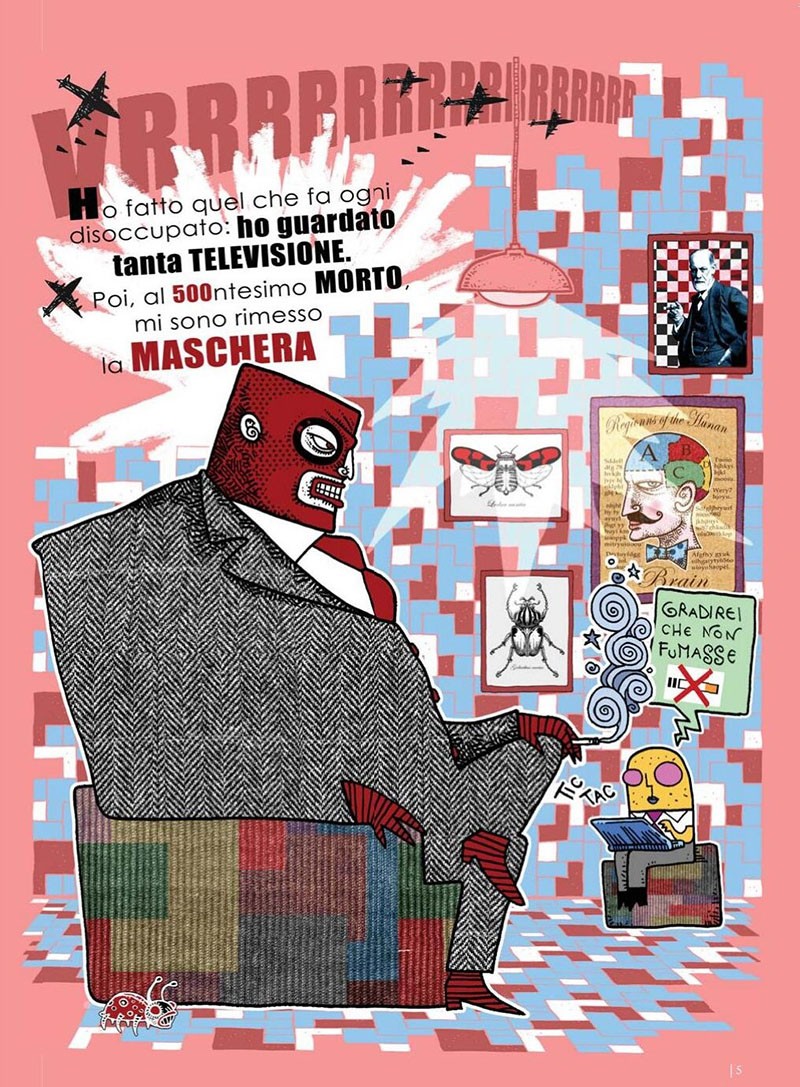 In “il piano nillapizzi” avevamo lasciato Mascherina nel 2008, alla ricerca di un destino e di un’identità, finalmente smascherati. Però qualcosa deve essere andato storto, se qui ritroviamo il nostro supereroe davanti alla tv, sempre più depresso e, soprattutto, di nuovo mascherato. L’anno dei misfatti è sempre lo stesso 2008, però è quasi Natale e piovono missili e bombe.