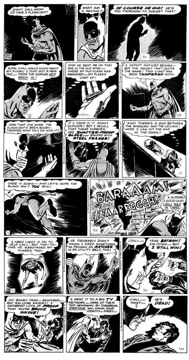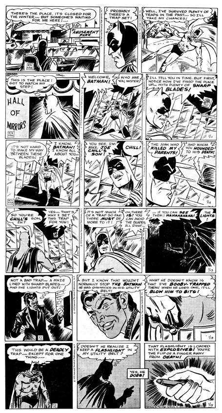 Osservandole in parallelo, salta agli occhi come inizialmente l’anonimo sceneggiatore del Ledger Syndicate segua la trama di Ellsworth. Le strisce dell’11-13 gennaio hanno gli stessi dialoghi nella versione inedita e in quella pubblicata. Nella casa degli specchi, il misterioso nemico di Batman rivela di essere Michael Chill, il figlio di Joe Chill (l’assassino dei genitori di Bruce Wayne), ma non viene visualizzato. Dal 14 gennaio, le cose cambiano. Nella versione inedita, Batman torna alla Wayne Mansion per confabulare con Alfred, e nell’ultima vignetta della striscia del 18 gennaio la scena si sposta in un’altra città, dove tre loschi figuri minacciano Dick Grayson (alias Robin). È evidente che Ellsworth ha in mente ulteriori sviluppi e che la storia dovrebbe proseguire ancora per alcune settimane. Nella versione del Ledger, invece, Chill viene visualizzato da Stout sin dal 14 gennaio, e la storia si conclude già il 22 gennaio, dopo che Chill è rimasto vittima di uno dei suoi stessi trucchi (ha infatti manomesso con l’esplosivo i gadget di Batman, come si apprende anche dalla didascalia nella striscia inedita del 18 gennaio). Una conclusione frettolosa, dunque, che serve al Ledger per chiudere la continuity di Ellsworth prima di introdurne una nuova, stavolta sviluppata negli uffici del syndicate.