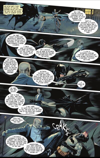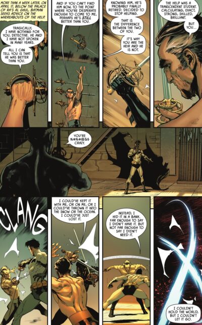 - Durante una sessione di addestramento ambientata nel passato, Ra’s al Ghul rimprovera a Bruce Wayne di non mentire perfettamente, gli dice che è ancora troppo puro per accettare la menzogna. Tre vignette più in basso la Testa del Demone spiega al futuro Crociato Incappucciato qual è il dono che ha lasciato nella sua stanza con queste parole: “Non è altro che il mio bene più prezioso. Ho ucciso molti uomini per ottenerlo, e ancora di più per conservarlo. Un oggetto da portare sempre con te per ricordarti che, anche se te ne vai, anche se pensi di poter rifiutare tutto quel che sono… tu sei il mio retaggio e rimarrai sempre il mio unico vero erede“. Se il regalo consiste davvero nella cosa più preziosa che ha, perché Ra’s la regala a un uomo che, come ha capito, non diventerà mai come lui? Perché prima specifica che la menzogna è fondamentale e poi parla in modo apparentemente sincero? La lezione del villain sulla menzogna è veicolata tanto dalla retorica quanto dal dono, ossia l’occhio. Inoltre, più avanti scopriamo che Batman non ha mai fatto domande su ciò che ha ricevuto, probabilmente perché non gli interessa se non in certi termini: per lui l’oggetto è solo il simbolo di un allenamento concluso e dell’uomo che non vuole diventare, verso il quale assume un atteggiamento critico.
