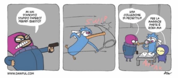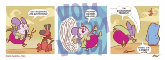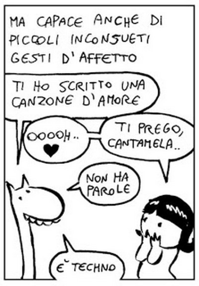 Difetti non tanto legati ai disegni, che sono funzionali al mio tipo di comicità, quanto ai testi. Sto cercando di ritrovare quella “spinta iniziale” che un tempo era facile avere e che adesso raggiungo solo attraverso complicati “artifici” mentali. Ho perso un po’ di vista l’Essenziale, quindi aspetto di ritrovarlo per cominciare a giocarmela davvero con questa concorrenza.