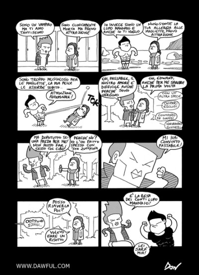 Nel rispondere ad una tua precedente domanda ti dicevo di come ho l’impressione che in Italia vada per la maggiore un fumetto, anche ben scritto per carità, di gente che mi racconta cosa ha mangiato per pranzo o del suo programma televisivo preferito. Aprendo il blog naturalmente anch’io ho accettato di raccontarmi, ma sempre in maniera spietata, autocritica e per lo più negativa.