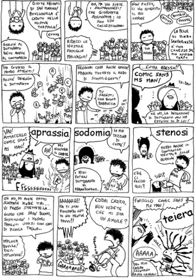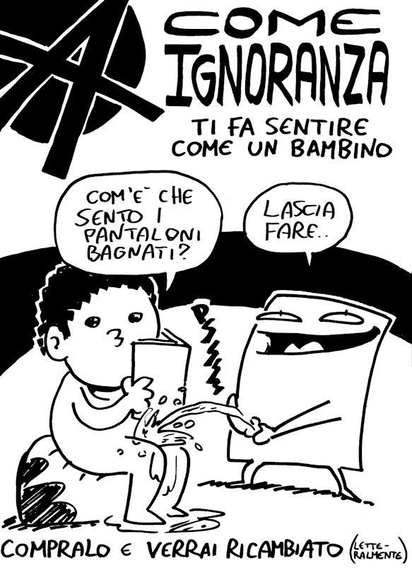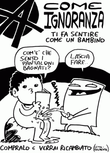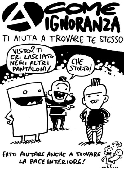 In fin dei conti il fumetto è una forma di linguaggio e per certi versi chi fa fumetti, secondo me, cerca di esprimere in questa forma quel che attraverso un’altra gli riesce meno. Ad esempio con le parole: io parlo male, mi mangio le parole, ho un forte accento bergamasco e magari alcune volte con i fumetti riesco ad esprimere come voglio certi concetti. Ok, ci sto girando un po’ intorno comunque ultimamente a ‘sta storia del guadagnare ci sto pensando più seriamente… più che altro perché ho scoperto che nessuno mi regala niente, nessuno mi lancia cibo gratis per strada e pian piano mi sto anche facendo convincere, nonostante le mie ostilità, a buttarmi sul merchandising. Ricordo a questo proposito che realizzammo delle magliette “tua madre” che vendettero davvero un botto, anche tra coloro che non avevano mai letto A come Ignoranza.