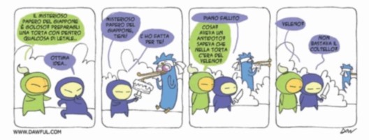 Rari i tuoi ammiccamenti alla cultura pop delle serie tv e delle pellicole americane. Giusto la mortifera Signora Fleccier, l’obeso Stiven Sigà e la coppia della saga-tormentone Twilight. Scarso interesse per le parodie o paura di finirne un po’ schiavo?