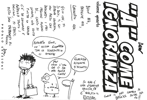 PS: ProGlo e’ l’attuale editore di Davide quanto finora l’unico che abbia mai pubblicato suoi fumetti. Era previsto che diventassimo il suo ex-editore con il sesto volume di A come Ignoranza pubblicato l’anno scorso, ma poi Davide ci ha chiesto due mesi fa di pubblicarne un settimo.