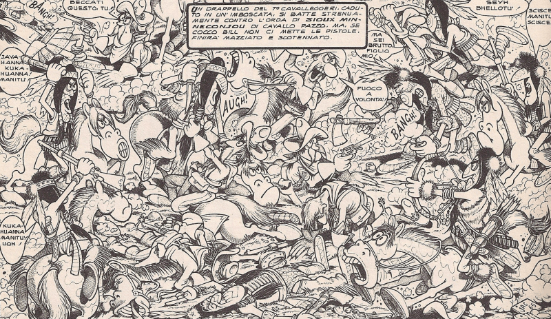 Vignette dense di dettagli, un linguaggio verbale fatto di parole spesso modificate, a simulare una pronuncia clownesca, un disegno che sarà fonte d’ispirazione e di imitazione di tutta una generazione di fumettari; questi sono gli ingredienti che lo stregone Jacovitti mescola nel suo prodigioso calderone; e il risultato è pura magia visiva, compositiva, narrativa, qualcosa che una volta letto si può e si deve rileggere all’infinito, perché non si corre mai il rischio di stancarsi di fronte a storie come Il sergente Cocco Bill, Cocco Bill in Canada, Kamumilla Kokobì e Cocco Bill e la revolucion.