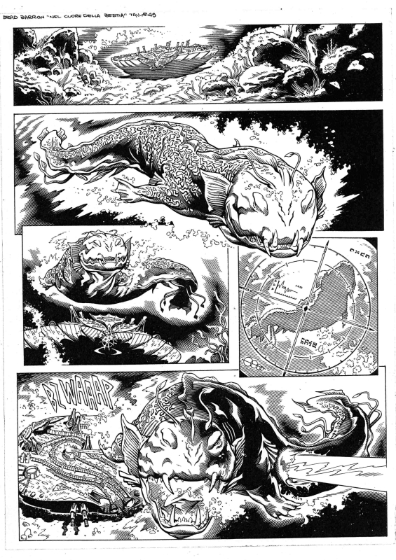 Un approccio più libero nell’affrontare il lavoro e un minor peso della responsabilità, di cui sei investito quando lavori a un personaggio dalla grande storia, come Mister No. Nel caso di Brad Barron infatti, partivamo tutti da zero e c’era molto da inventare, mostri,  mezzi, personaggi e tutti noi autori ne sentivamo l’enorme stimolo. Ogni disegnatore infatti ha potuto dare libero sfogo alla propria fantasia, cercando di riproporre il sapore e l’atmosfera di una certa filmografia di genere, alla quale si rifaceva tutto il progetto.