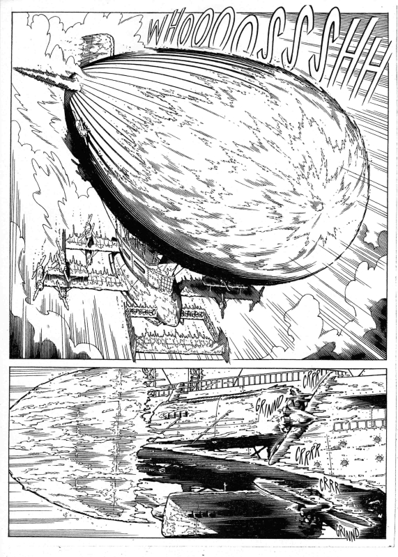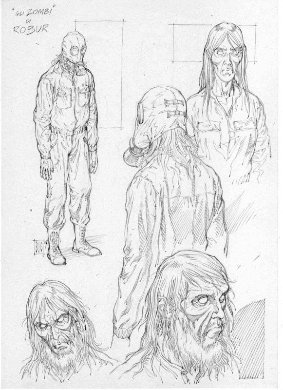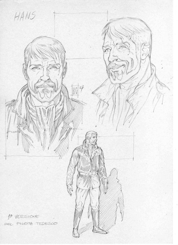 Ha origine tutto  dalla lettura del soggetto e di conseguenza della sceneggiatura, che inizialmente avviene in maniera veloce, in modo che possano istintivamente suggerirmi tagli e inquadrature. Poi il tutto viene riletto in maniera più accurata. In questa fase disegno anche un veloce storyboard di ogni singola tavola, ma sempre cercando se possibile di disegnarle tutte in maniera consequenziale, per mantenere una narrazione coerente e avvincente. Contemporaneamente provvedo a rintracciare quanta più documentazione possibile, che in genere viene fornita dallo sceneggiatore, ma che io cerco sempre di integrare con altro materiale. A questo punto realizzo gli studi solo dei personaggi principali o degli oggetti e dei mezzi protagonisti in quella sequenza. Dopodichè avviene la realizzazione della tavola, dapprima con schizzi vignetta per vignetta, poi con la definizione di tutti i disegni e,  successivamente, con l’inchiostrazione. Per quanto riguarda gli strumenti utilizzati, ne abbiamo già parlato ampiamente sopra.