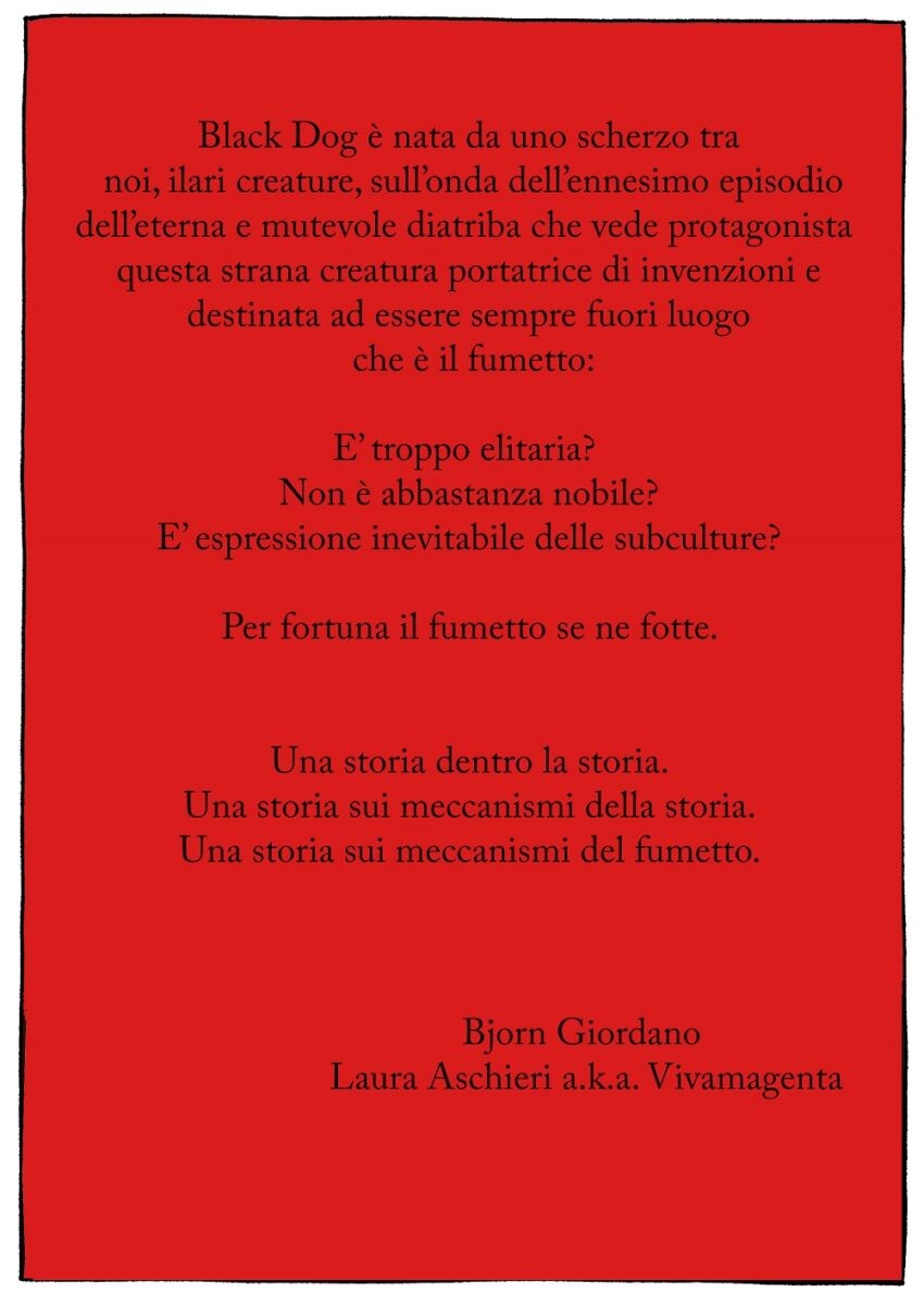 Lo Spazio Bianco presenta Black Dog, il nuovo fumetto breve di Bjorn Giordano, qui in veste di sceneggiatore, accompagnato ai disegni dalla brava Laura Aschieri. Un fumetto che parla del potente mezzo di comunicazione e creazione che è sempre stato, della sua genesi, della sua forma, delle sue insidie. E quale forma espressiva può parlare del fumetto se non il fumetto stesso?