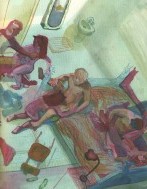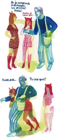Solo una manciata di titoli pubblicati, prima di Les Noceurs. Quelli del 2005 e del 2006 sono abbastanza introvabili, poi Nacht Dieren (in pubblicazione negli Stati Uniti per Top Shelf): due racconti senza parole tra china e acquarello. Il primo, dal titolo Schlecte Freunde (reminiscenze di lingua teutonica mi spingono ad azzardare significhi “Cattive compagnie”) è particolarmente efficace: una ragazzina viene rapita da un demone/strega la prima notte di mestruazioni e portata a un vero e proprio baccanale. I mostriciattoli, rigorosamente rossi, preludono a una delle caratteristiche salienti di Brecht Evens: la capacità di mescolare citazioni visive provenienti dalla cultura di massa e ripescaggi colti (si intravede Bosch), tipica degli artisti dal saldo immaginario.