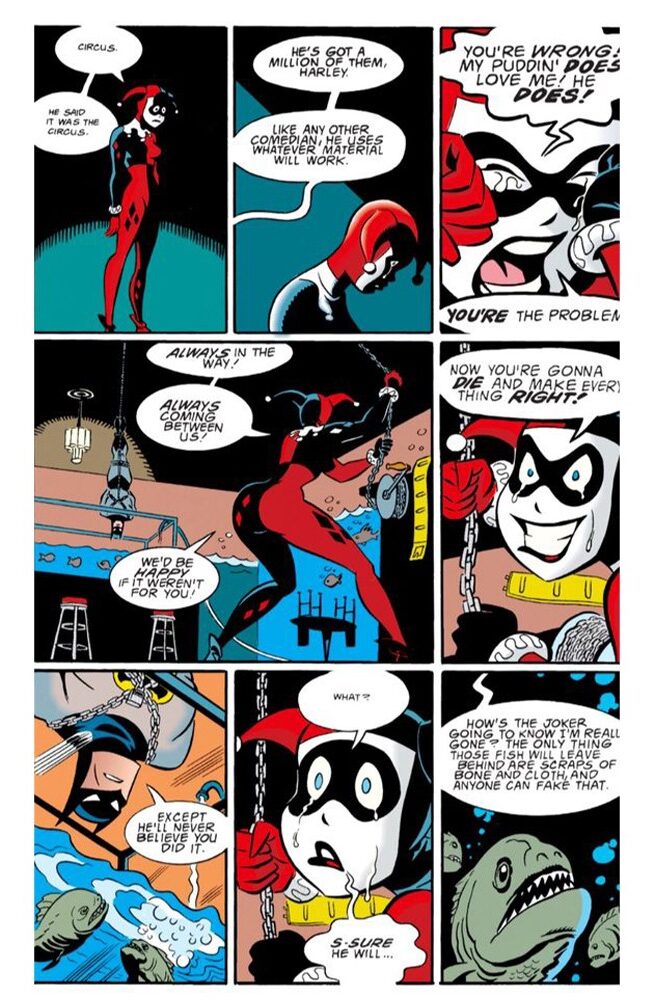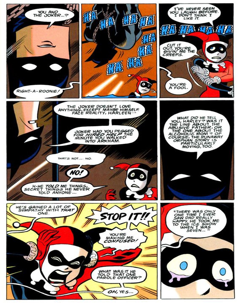 Harley è senza dubbio la protagonista del racconto. Da lei e con lei si muove l’intreccio: si innamora di Joker, lo libera, cattura Batman creando involontariamente le condizioni per una nuova cattura di Joker. È sia vittima che carnefice; fragile e debole nei confronti dell’idolatrato amante ma allo stesso forte e intraprendente per salvaguardare la relazione con lo stesso. C’è in lei, dunque, un carattere misto che si esplica in una recitazione polivalente e psicologicamente instabile, a seconda della situazione come in figura 2 in cui al cambiare dello stato d’animo cambia la recitazione.