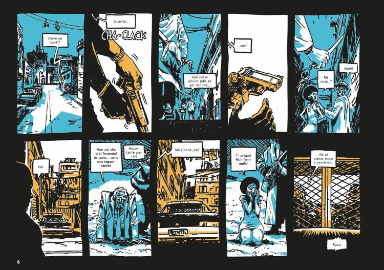 Palloni fa un lavoro eccellente nel costruire ogni tavola e nel guidare l’occhio del lettore con l’utilizzo di vignette di dimensioni diverse a seconda che si debba porre l’attenzione su un’azione in campo largo o a dettagli in campi strettissimi e primi piani su particolari dei volti dei personaggi. Il segno dell’autore si fa qui ancor più chiaro per concentrarsi sulla ricerca del dettaglio emotivo e recitativo dei personaggi, ma anche nella ricostruzione storica di abiti, accessori e scorci della città. Al tempo stesso, per restituire l’atmosfera caotica e la tematica cupa, i disegni si riempiono di ombreggiature e chiaroscuri, con l’incursione del colore ocra per rappresentare le calde giornate del presente e il blu per raccontare il passato: una semplice idea che però rende più comprensibile la lettura e che permette anche di giocare in alcuni momenti con lo sfasamento dei piani temporali.