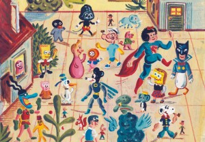 Uno dei pezzi principe delle sue mostre è un baule da viaggio che aperto mostra una collezione di giocattoli che sono stati poi stravolti e reinterpretati dall’artista tedesco che ha abbinato all’originale un suo disegno/opera (The Toy Box, 1997). Ci sono poi i suoi Daily Painting, cartoncini 12 x10 cm su cui dal 2006 schizza liberamente ogni mattina tutto quello che gli passa per la testa (e pare che la pila di questi cartoncini cresca ogni anno di quasi trentacinque centimetri). Oppure c’è Old School dove vengono riprese le pose dei supereroi o dei protagonisti del fumetto poliziesco, liberandole dallo sfondo e a volte addirittura dai lineamenti del viso.