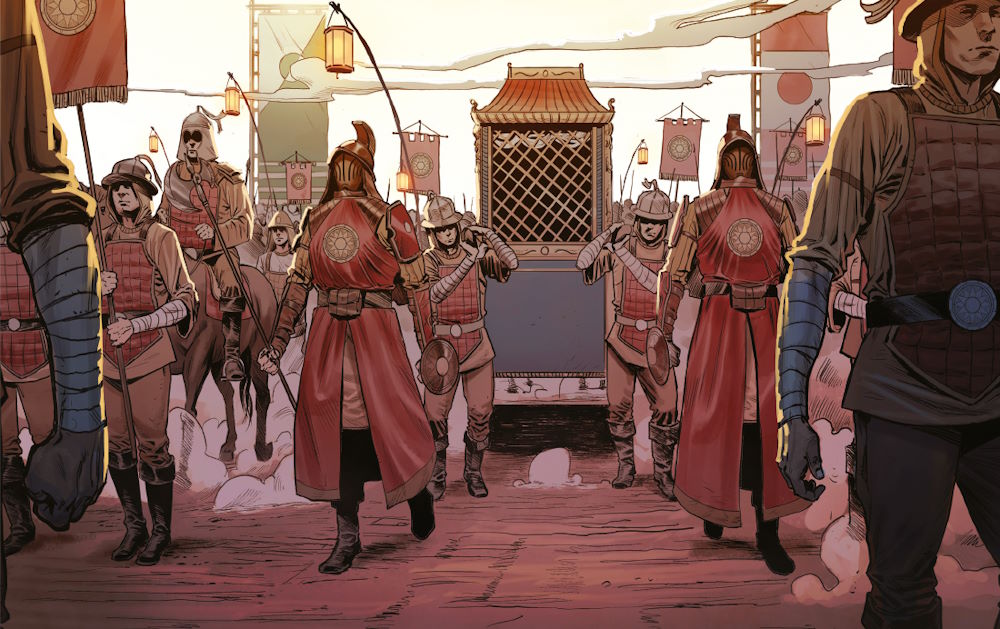 C: Una storia che ti parla di un problema che non credi di avere, immagino. Il progetto è stato venduto letteralmente come “1984 incontra Il Nome della Rosa“, quindi direi che il riferimento a queste due opere è ineludibile. Diciamo i temi del primo (seppur con molta meno aderenza politica), nelle atmosfere del secondo. Si tratta però di corrispondenze che possono colpire il lettore al massimo come suggestioni. Per intenderci: quando penso a una scena di massa con soldati, m’immagino sempre le sequenze di Ran di Kurosawa, ma penso sia più un meccanismo mio implicito che esplicitato nelle pagine. Un libro che mi ha fatto capire come volessi affrontare un tema così complesso e astruso come il capitalismo di sorveglianza è sicuramente Mediterraneo di Sergio Nazzara e Luca Ferrara: anche secondo le riflessioni di Galimberti, i temi vanno suggeriti prima che infilati a forza nel cervello del pubblico passando per gli occhi. Panoptikon ha molte parti dialogate e molte spiegazioni, certo, ma ho cercato di essere sempre a un passo prima dall’incomprensibilità. Dire l’indispensabile e solo quello per essere capiti mi pare l’unico modo per essere sicuri di non diventare logorroici. Si parva licet, è una lezione che ho imparato invece da Alan Moore: la scansione delle sue vignette mi ha sempre dato un’idea di necessità inesorabile. Quelle vignette stanno lì per un motivo e non per riempire la pagina e il ritmo che ne consegue è una delle sue più grandi qualità come sceneggiatore.