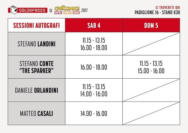 Gli autori presenti allo stand saldaPress – collocato nel padiglione 16, stand K30 – saranno Matteo Casali (creatore di QUEBRADA e co-creatore di ZEROI), Stefano ‘TheSparker’ Conte (creatore e disegnatore di VOLT – CHE VITA DI MECHA), Stefano Landini (disegnatore di QUEBRADA) e Daniele Orlandini (disegnatore di RIM CITY). Nella tabella le date e gli orari in cui sarà possibile incontrarli.