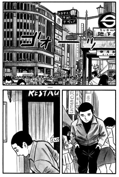 Un ruolo fondamentale svolgono poi le onomatopee, che contribuiscono spesso a enfatizzare le singole vignette. Tatsumi si discosta dall’uso di esse come scansione temporale che ne faceva Masahiko Matsumoto, storico precursore del gekiga, che usava ad esempio il ticchettio di un orologio in una serie di pannelli per definire lo scorrere del tempo, mentre l’autore di Osaka aumenta l’impatto visivo intensificando i suoni, creando un rapporto tempo-energia, come fa notare benissimo Ryan Holmberg in una serie di articoli su The Comics Journal.