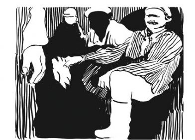 Con un disegno dal tratto così austero da sembrare quasi “inciso” sulla tavola e un’abbondanza di nero che avvolge luoghi e personaggi, l’autore narra una piccola fiaba densa di significati.