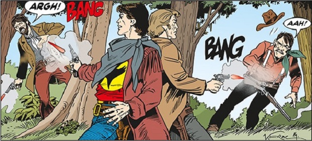 “Il passato di “Guitar” Jim” è un racconto di stampo fortemente classico che traccia una parabola di formazione alla vendetta. Moreno Burattini sa dosare bene il ritmo e la lettura procede spedita, alternando alle belle scene d’azione nel presente il resoconto del lungo percorso nel passato che porta Jim, ferito, nella capanna del Signore di Darkwood. La sensazione, però, è che la storia, pur godibile, sia più meccanica che organica: gli eventi si incastrano gli uni agli altri senza deviazioni casuali o imprevisti, come se la ragion d’essere di ciascuno di essi sia la mera funzionalità all’architettura complessiva. Ne è un esempio la successione troppo rapida e senza soluzione di continuità dell’apprendistato di Jim nell’arte della chitarra e della pistola, quasi fossero ingredienti da giustapporre per la buona riuscita di una ricetta. Un tale incasellamento di situazioni ha un effetto di appiattimento anche per i personaggi, ed è un peccato, perché figure come il musicista Kristofferson, il proprietario del saloon Swearengen o gli antagonisti Reagan, Gilliam e Clancy non hanno l’approfondimento che meriterebbero, perdendo importanza e divenendo poco più di comparse. Verrebbe da pensare che Burattini abbia voluto rispondere a troppe domande su Jim in un colpo solo, finendo, dato lo scarso spazio a disposizione, col privare la storia del necessario respiro.