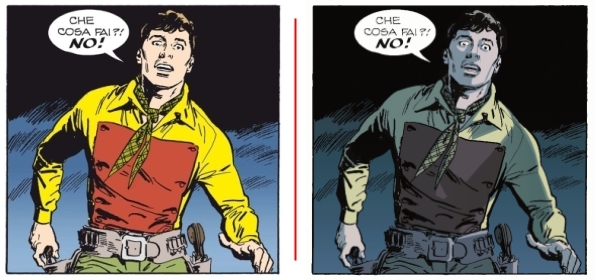 Mi ripeto, non volevamo dire “il nostro colorista é migliore del vostro”; volevamo far notare che la colorazione stampata é lontana anni luce da una colorazione “verosimile” moderna. Il giallo della camicia di Tex, sempre lo stesso tono, sempre immacolata, sempre luminosissimo anche di notte, é una scelta che non é del colorista. Il colorista non é l’oggetto del nostro discorso. É scelta editoriale, che preferisce esaltare, confermare, ribadire il “brand” del colore della camicia di Tex SOPRA la verosimiglianza del colore.