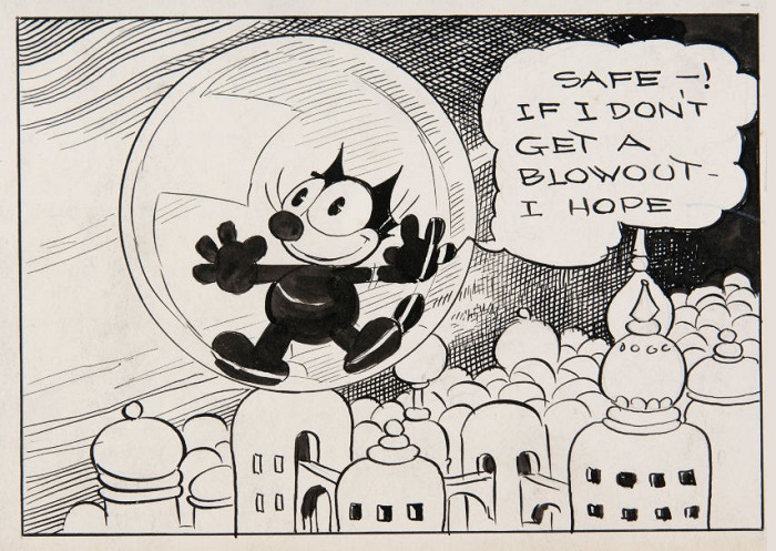 Questa abitudine ha portato certamente un ritardo nelle mie capacità di concentrarmi sulla parola scritta (l’attenzione necessaria per la lettura l’ho ottenuta solo più tardi e con sforzo), ma la lettura delle figure senza parole è stata certo per me una scuola di tabulazione, di stilizzazione, di composizione dell’immagine. Per esempio l’eleganza grafica di Pat O’Sullivan nel campire nel piccolo cartoon quadrato la sagoma nera di Felix the Cat su una strada che si perde nel paesaggio sormontato da una luna piena nel cielo nero, credo che sia rimasta per me un modello.