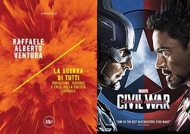 In un ulteriore sottocapitolo, “Civil War”, viene evocata invece una nuova citazione fumettistica assolutamente centrale: oltre che al capitolo, infatti, rimanda chiaramente al titolo dello stesso saggio, “La guerra di tutti” che è, naturalmente, la guerra civile stessa. Ventura analizza come “Civil War” (identificando temi simili anche nei cinecomics DC, e altrove) passi dalla critica in metafora del Patriot Act a una posizione più sfumata: nel primo testo Capitan America è presentato dalla parte della ragione, mentre in seguito i torti sono equamente distribuiti.