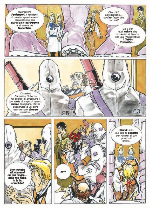 Si prosegue in senso profondamente orwelliano, l’orrore del cubicolo (che coincide con la griglia fumettistica), la dominanza del Nocchiero, espresso dal simbolo del Timone che da un lato richiama la croce celtica del neonazismo, dall’altro evoca il Grande Timoniere Mao. Il tema della virtualità del reale, usato qui per schiacciare i sottoposti, ha valenza metaletteraria che si espliciterà in seguito.