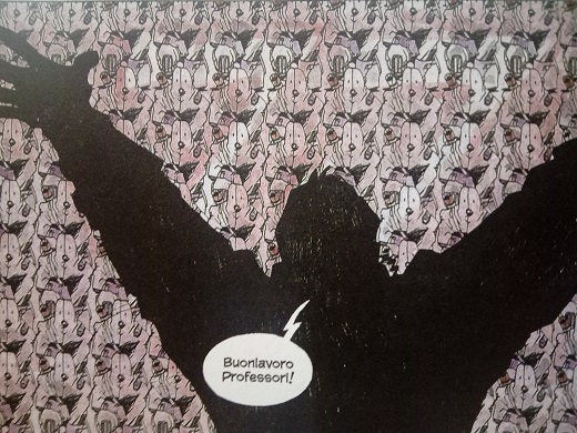Il tutto, però, avviene operando in modo mirabilmente specifico: se Orwell estrapolava dal totalitarismo anni ’40, primariamente sovietico; se Moore aggiornava agli anni ’80 tatcheriani, Bilotta pesca a piene mani dall’immaginario italico, e il risultato è quindi totalmente autonomo.