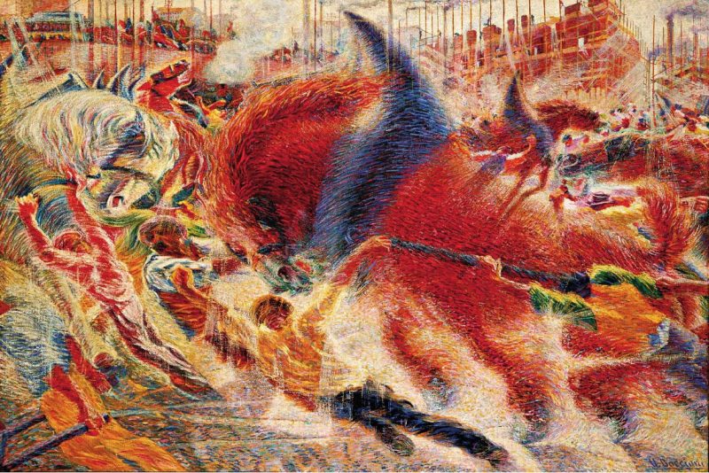 Appare evidente che il magistrale lavoro di Bilotta non sarebbe stato possibile senza il supporto determinante, sotto il profilo visivo, di Carmine Di Giandomenico. Qui ci si soffermerà più sull’aspetto testuale per chiarezza di analisi (la disamina dei disegni meriterebbe un post autonomo, che si potrebbe anche fare ma esula un po’ dal tema di questo blog, incentrato sul rapporto tra letteratura e fumetto): ma, per dire, è fondante nello spiazzamento angoscioso del lettore il segno scavato con cui Di Giandomenico intarsia il volto di ogni personaggio, infiggendovi l’espressione sofferente che la maschera della Smorfia sintetizza, rendendoli tutti uguali in un atteggiamento che dev’essere di neutralità per ordine di regime, ma che riesce a mostrare comunque un senso tragico impressionante proprio per il suo essere forzatamente rattenuto. Il gioco di ripresa del futurismo, poi, passa innanzitutto per l’aspetto visivo, non tanto tramite singoli inserti ma per una compiuta metabolizzazione di quella galassia di segni, a partire forse dalla “Città che sale” di Umberto Boccioni. Qui però, per esigenze tematiche e di sintesi, seguiremo soprattutto la fitta trama insita nella scrittura di Bilotta.
