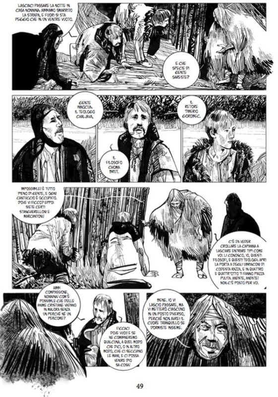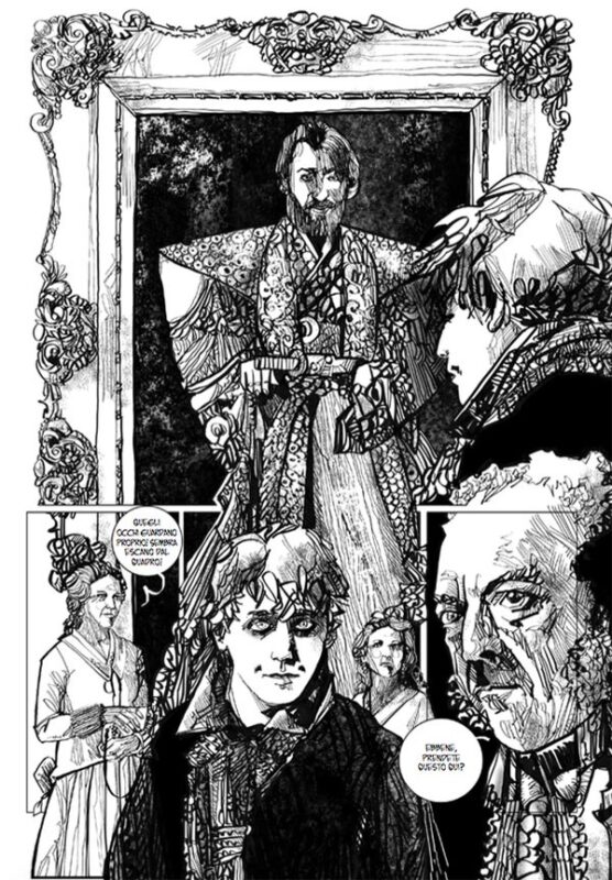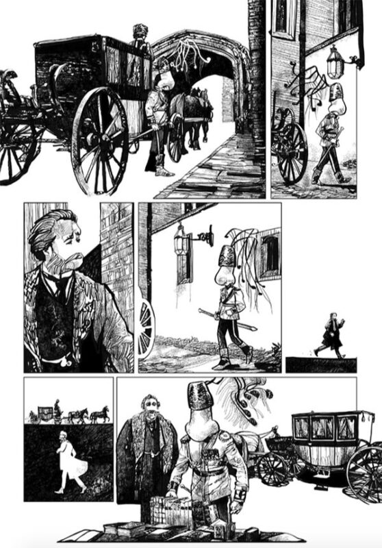 Il disegno di Francesco De Benedittis è particolarmente congeniale a queste cupe storie gogoliane. Il suo segno, pur nell’innegabile indipendenza e con soluzioni anche differenti, evoca qualcosa di Sergio Toppi, che ultimamente mi pare al centro, giustamente, di una nuova attenzione da parte delle nuove generazioni di disegnatori.