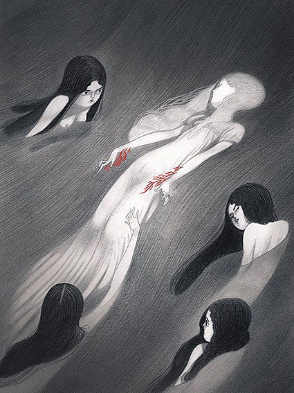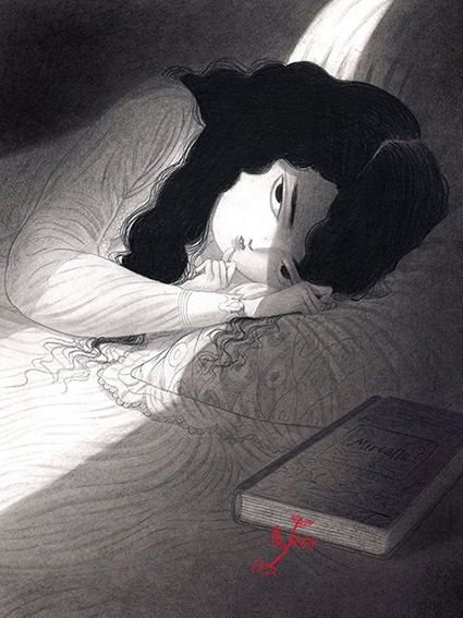 Realizzate con la tecnica della grafite su carta, le novanta illustrazioni che impreziosiscono l’opera riescono a darci una lettura che è sia personale, sia fedele alla sottile inquietudine che percorre il capolavoro gotico. Particolarmente emblematica ed efficace già l’immagine di copertina, con Carmilla a testa in giù, coerente con la sua natura vampirica ma lievemente disturbante a livello percettivo per il lettore. Siamo nel campo dell’orrore sottile dell’Unheimlich, il “disturbante” freudiano, in grado di inquietarci in punta di fioretto (acuminato e sanguinante) senza bisogno delle motoseghe rotanti dello splatter.