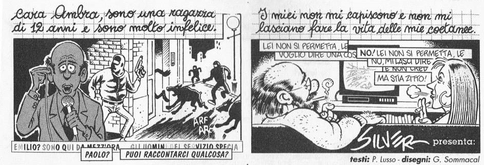A Tav. 2, il rimpianto per il Governo Dini è ovviamente ironico, una delle tante mediocri tecnocrazie tra un regno di Berlusconi e l’altro (quanto è cambiato oggi!). La TV rimane immutata, tra l’Allegria di Bongiorno e i Consigli per gli Acquisti di Costanzo. Appare poi anche il comico Paolo Rossi, come un residuo dimenticato del passato. A Tav. 3, mentre i genitori guardano Cinico TV, vediamo che la polizia (che ha le insegne di Fininvest, ci accorgiamo) del servizio di Brosio è giunta proprio nell’appartamento della ragazzina e dei suoi genitori per arrestarla (il lettore intuisce, ma non è palesato, che dipende dalle lettere che la ragazzina ha scritto, denunciando involontariamente i genitori: cosa che avrebbe comunque fatto volentieri in cambio di un decoder).