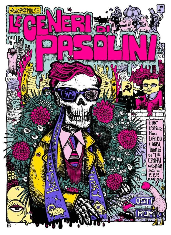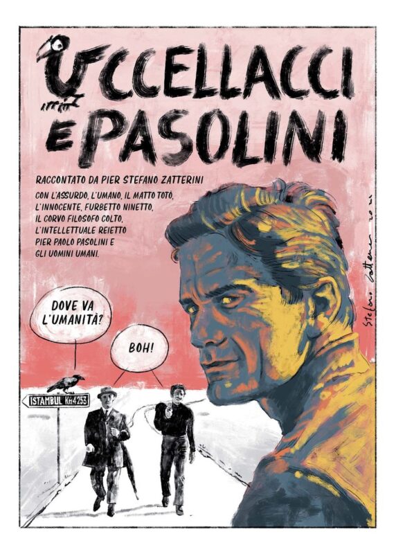Io in realtà sono stato chiamato in causa da Andrea Settis Frugoni di BARTA quando l’idea era già in piedi. Per cui su questo lascerei la parola a Nanni Spano, curatore della mostra e primo “complice” di questo progetto, che nella postfazione del volume scrive: “in occasione del centenario della nascita di Pier Paolo Pasolini, l’associazione culturale DayDreaming Project ha contattato una serie di artisti, conosciuti a livello nazionale e non solo, chiedendo loro di illustrare un volume a fumetti (…). L’intento era di fare contemporaneamente il libro e una mostra delle tavole appositamente disegnate, illustrate, scritte, immaginate per il progetto”.