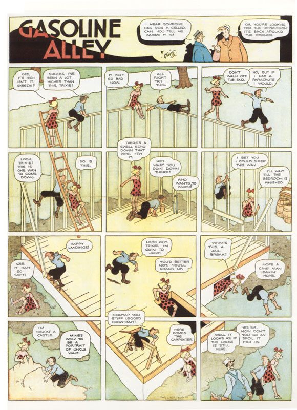 Le sperimentazioni di De Luca, in effetti, erano già presenti nel fumetto americano, come ad esempio in Gasoline Alley, dove troviamo dei formalismi simili già in molte tavole collocabili intorno al 1947. Sono sicuro che, andando a spulciare più indietro, si potrebbero trovare esperimenti anche precedenti in tal senso, forse meno sistematici.