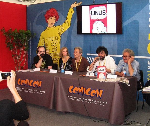 Dopo una breve introduzione di Interdonato sul progetto editoriale del libro, la parola è passata subito ad Anna Maria Gandini, moglie di Giovanni Gandini, fondatore della rivista. Gandini ha ripercorso le tappe dell’ideazione e della nascita di Linus nei locali della libreria da lei gestita insieme alle socie Laura Lepetit e Vanna Vettori e all’apporto dato al primo nucleo di redattori, insieme a quelle per l’acquisizione dei diritti per la traduzione e la pubblicazione delle strisce di Charles Schulz. Un’idea che si è subito rivelata vincente e che in poco tempo ha riunito attorno alla rivista un nuovo e vitale gruppo di intellettuali sensibili alla capacità comunicativa del fumetto e che ha ridato piena dignità in Italia alla Nona Arte.