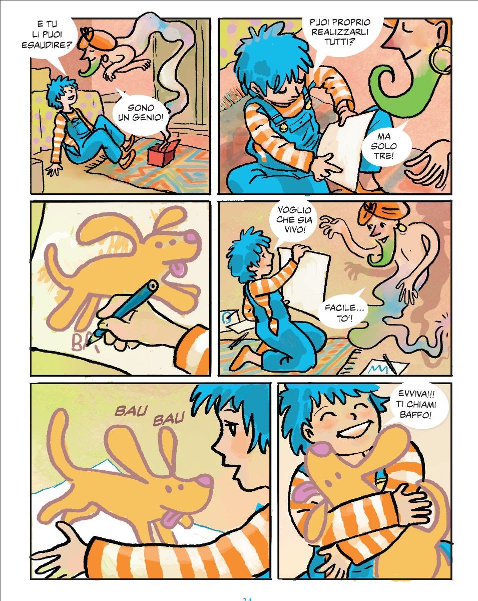 In questo primo volume Sarah racconta come si è svegliata con i capelli blu e la sua avventurosa caccia al tesoro del mare blu… ma ora, nella nuova casa dove ha appena traslocato una nuova avventura ha inizio, con un simpatico genio che esaudisce i desideri e un cane uscito da un disegno su carta… La fantasia, la fiducia, l’amicizia e la creatività sono i fili conduttori delle storie di Sarah, che al loro interno nascondono piccoli giochi e indovinelli interattivi…