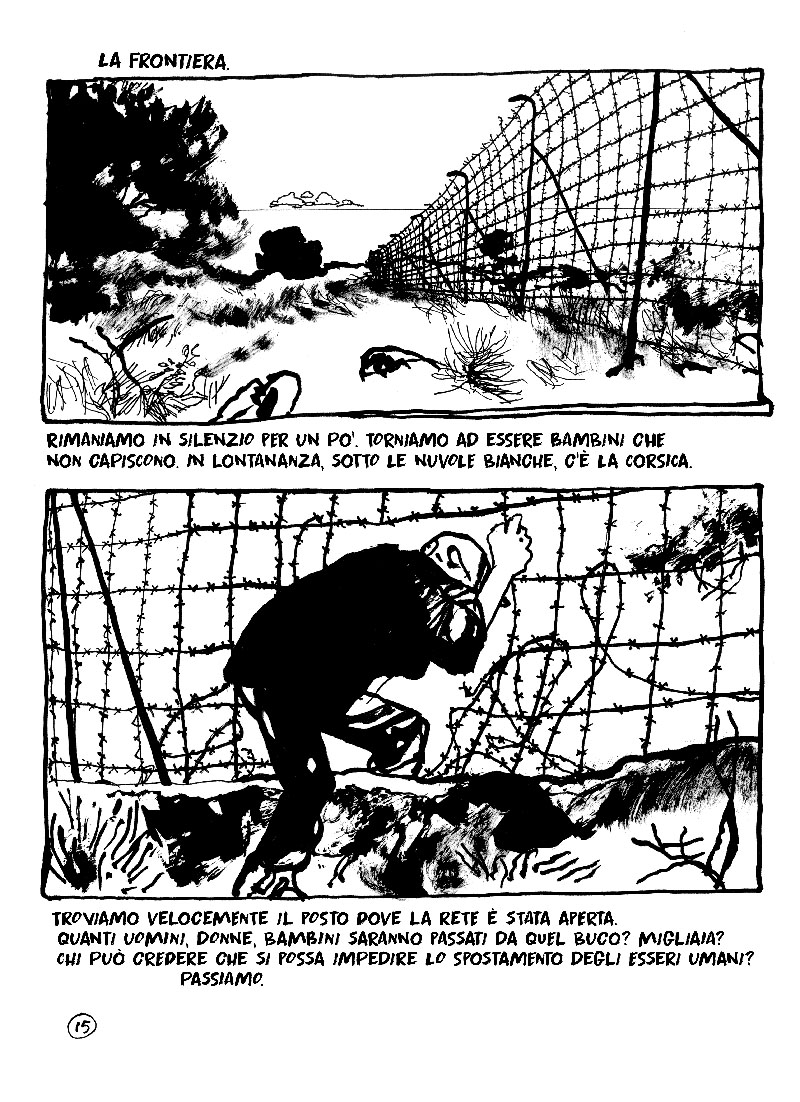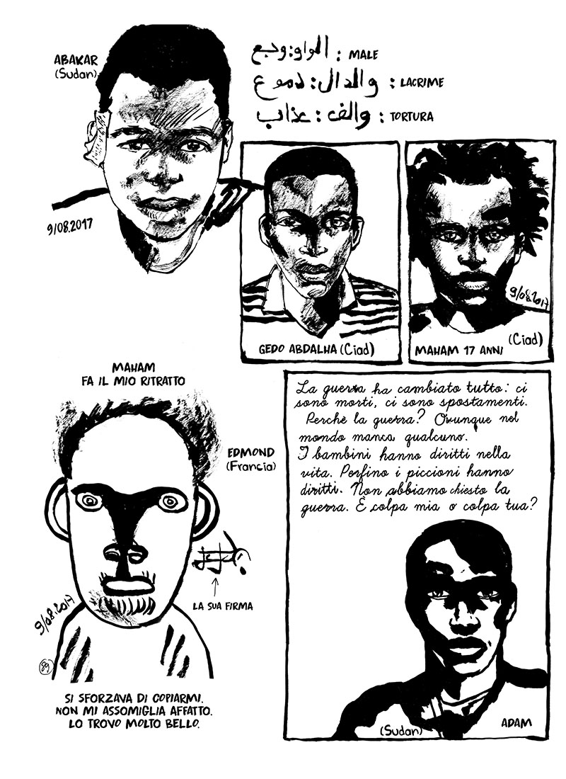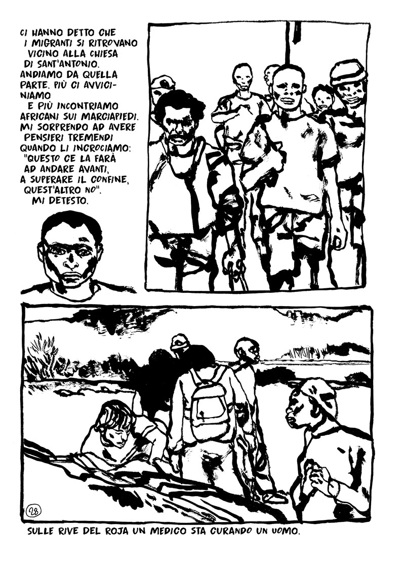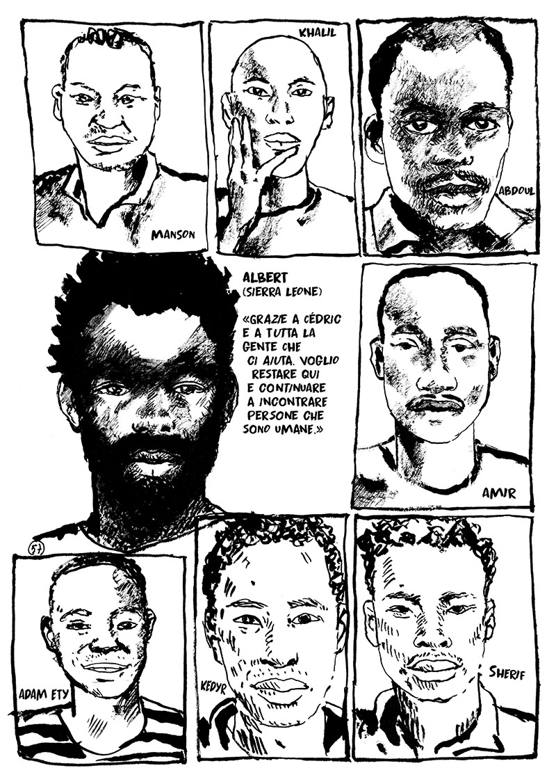 Nel fumetto si dà voce a tutti questi uomini e donne che aprono le porte, aiutano, condividono cibo. Nipoti di ebrei, che ricordano l’ingiustizia, donne di paese, accoglienti per convinzione, preti, spesso mal visti e osteggiati, allegri punk e personaggi che arrivano da tutto il mondo. Legati dall’umanità. Ma si dà voce anche a questi esuli, frammenti timidi di testimonianze, date in cambio di un ritratto: l’identità.