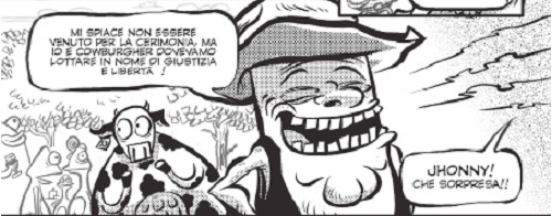 Tra inseguimenti e onomatopee, vignette e impaginazione che si muovono liberamente per le pagine, dando dinamismo all’intero racconto, l’effetto comico si trascina fino alla fine dove l’ultima immagine è dedicata alla minaccia del ritorno di un mostro bionico con la testa di Hitler e la svastica sul petto.