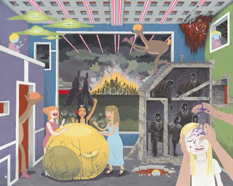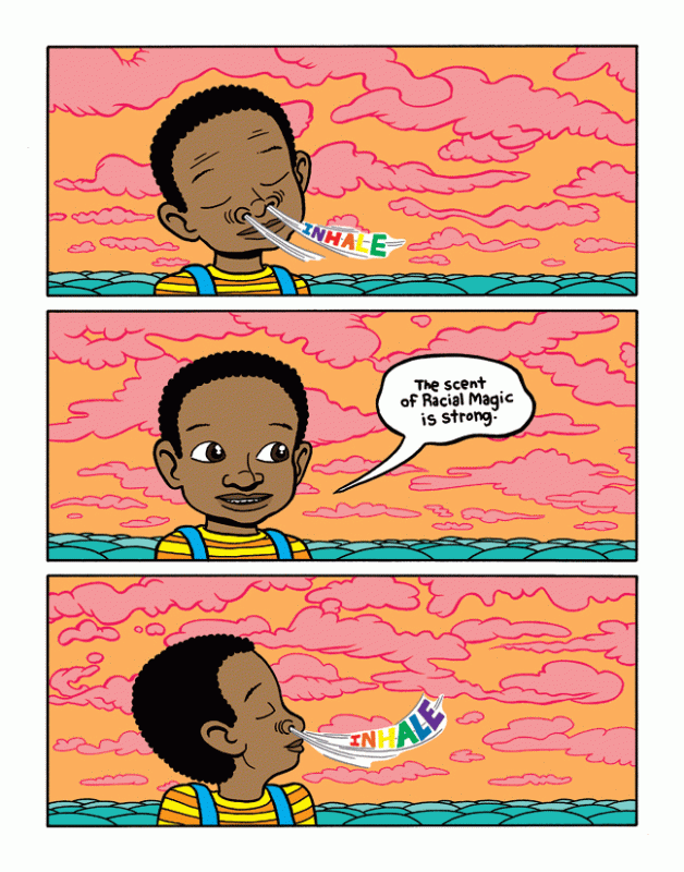 Da citare invece come perfetto esempio di una collaborazione che funziona a tutti gli effetti è l’incompiuto “The White Rhinoceros”, pubblicato negli ultimi quattro numeri della rivista «Mome», per i testi di Shaun Partridge. Una surreale storia ambientata nel paese di Razzalandia, impregnato di “magia razziale” e popolato da esseri strani, mostri e veicoli con caratteristiche piuttosto singolari. Due umani si trovano improvvisamente catapultati in questa situazione e hanno delle difficoltà ad adattarsi, anche a causa dei fraintendimenti linguistici con gli abitanti che incontrano: i modi di dire e i giochi di parole, tipici della lingua inglese, hanno qui un’accezione completamente diversa, provocando un forte disorientamento nei personaggi principali. Purtroppo la storia non si è conclusa a causa della chiusura anticipata dell’antologia, ma si nota fin dalle prime pagine che l’equilibrio tra la follia della storia e dei dialoghi e la giocosità del disegno e degli eccessivi colori pop è totale. Ci troviamo solo apparentemente distanti dalle atmosfere tipiche delle storie di Simmons, ma se togliamo la tragicità di cui è pervasa la maggior parte delle sue opere, quello che rimane è quell’ironia e quella follia che qui hanno un’accezione più allegra e spensierata.