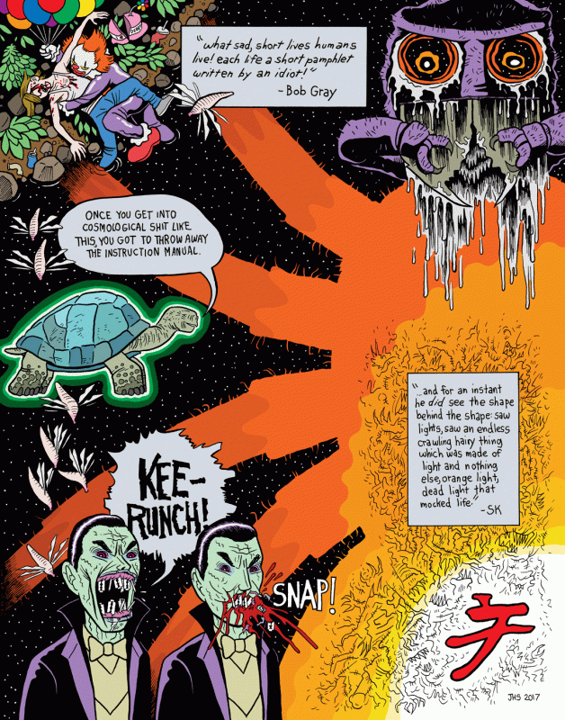 Questa panoramica dell’opera di Josh Simmons non si può però considerare conclusa senza parlare in dettaglio di The Furry Trap, l’antologia di undici racconti che sintetizza in maniera esemplare il suo concetto di horror, ma soprattutto di Black River, il graphic novel pubblicato nel 2015, che rappresenta il punto più alto e maturo raggiunto fino a questo momento dall’autore… ma di questo avremo modo di parlare nei prossimi due appuntamenti.