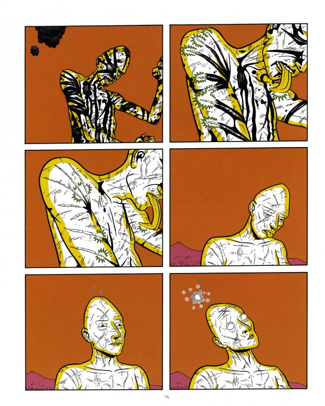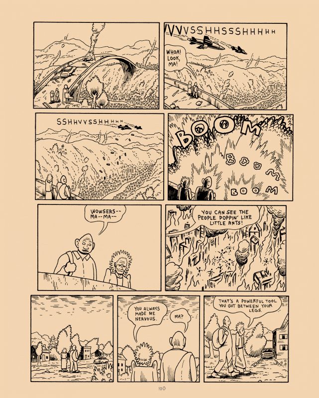 “Head of a Dog” è la criptica storia di una tavola di un uomo che su una nave, che assomiglia quasi a un piccola città, grida che quella stupida barca ha la testa di un cane. A questa segue “Jesus Christ”, un racconto senza parole che abbandona ogni pretesa realistica e abbraccia il registro surreale e simbolico: qualcosa cade su un pianeta e si rivela come un gigantesco centauro pieno di cicatrici, che sconvolge la vita degli abitanti, visti solo in qualche vignetta come esseri microscopici che emettono suoni incomprensibili. Alternando momenti violenti ad altri più onirici, la creatura si scatena sul pianeta e sulla città tentacolare. Il senso del racconto non è immediatamente comprensibile sebbene, sia per il titolo che per certi simboli, possiamo intuire che rappresenti i sentimenti contrastanti di attrazione e repulsione di Simmons verso la religione, probabilmente considerata come una commistione inestricabile di violenza e amore. È una storia che lascia al lettore la propria interpretazione, che agisce nel subconscio, come molte delle situazioni descritte negli altri racconti, che agita qualcosa nel profondo, che riesce a entrare in contatto con chi guarda sbigottito queste pagine apocalittiche che si dispiegano sotto i nostri occhi e che si interrompono improvvisamente, sebbene si possa intuire che la sospensione corrisponda a un momento di pausa da parte dell’essere “divino” (?) prima che si scateni ancora una volta in una nuova zona del pianeta oppure su un’altra città.