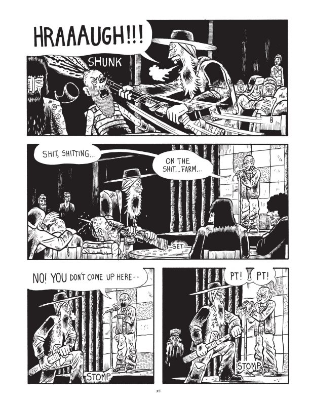 Durante il loro viaggio, incontrano vari esempi di questa umanità che sta regredendo in maniera sempre più accentuata. Una ragazza, Caramel, li conduce in un locale dove un vecchio comico si esibisce in uno spettacolo di cabaret, davanti a uno scarso pubblico più interessato alle pasticche di Gumdrop, una droga gratuita a disposizione degli avventori, che al monologo dell’uomo. Entra un nuovo gruppetto di disperati strafatti: prima il capo ammazza uno dei suoi perché disturba lo spettacolo, poi fa letteralmente a pezzi il comico e inizia a improvvisare lui stesso un monologo. La conseguenza è che viene crivellato di proiettili dal gruppo delle donne. Un’esplosione di violenza immotivata che finisce bruscamente così come era iniziata.