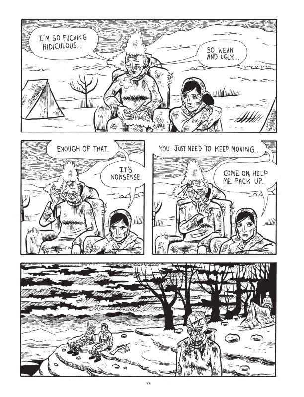 Il viaggio continua, senza particolari eventi: il cammino procede, punteggiato solo dalle soste per riposarsi, mangiare e dormire. Due donne sembrano particolarmente segnate dagli avvenimenti precedenti, e parlottano tra loro: durante la battaglia erano finite in un lago, ma erano riuscite a salvarsi. Anna, una delle due, afferma di essere sicura di quello che aveva visto e a un certo punto, durante la marcia, si suicida sparandosi in bocca. L’altra donna si confida e rivela quello che aveva sconvolto così profondamente Anna: la morta era convinta di aver visto viva la compagna che era stata uccisa dai violentatori mentre, in fondo del lago, si stava mangiando un uomo.