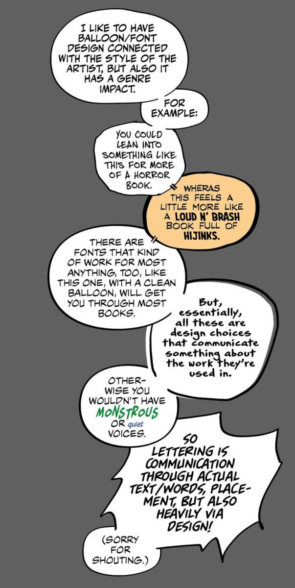 Sai, ho una pessima memoria anche a breve termine, quindi sinceramente non saprei darti una risposta a questa domanda. Penso però che il primo fumetto completo che ho letterato sia una storia di Deniz Camp, che dovrebbe uscire nel 2021. L’ho fatto nel 2016, credo, e ho rifatto due o tre volte il lettering nel corso degli anni, poiché sentivo che le mie capacità stavano migliorando. Quindi ho uno strano rapporto con quel fumetto, che, quando alla fine uscirà, in teoria sarà sia il mio fumetto più recente che il primo in assoluto su cui ho lavorato!