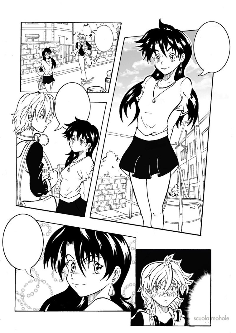 battesimo anche come letterista. Ho sempre avuto una pessima grafia e il mio primo tentativo fu quello di lettera dal computer. Non avevamo però uno scanner e, in pratica, prendevo le dimensioni in centimetri sulla tavola fisica, le riportavo su Photoshop, scrivevo al computer, disegnavo i balloon e le didascalie e poi stampavo il tutto. Lo ritagliavo a mano e incollavo i pezzi sulle tavole originali. Insomma, mi ero inventato un ibrido tra lettering tradizionale e quello al computer. Quattro anni dopo affrontai la mia prima esperienza completamente digitale con Arcana Mater e subito dopo sul materiale della Alta Fedeltà (futura BD).