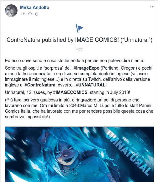 Ospite a sorpresa della manifestazione Image Expo, svoltasi a Portland (Oregon), Mirka Andolfo ha annunciato che il suo fumetto Contronatura, prodotto in Italia per Panini Comics, avrà da luglio 2018 approderà negli Stati Uniti, pubblicato da Image Comics con il titolo Unnatural.