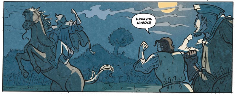 Sono due toscani – più precisamente livornesi – gli autori di Cosimo de’ Medici: Alex Lucchesi e Davide Susini. La coppia decide di concentrarsi su un preciso momento dell’esistenza del Medici, quello che portò al suo arresto ed esilio dalla città nel 1433 e al suo glorioso ritorno l’anno seguente.