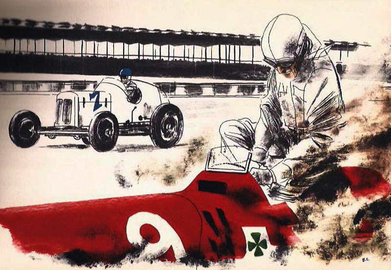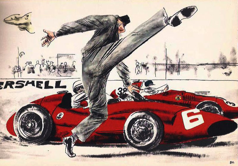 Sì, il trotskista Crepax era irresistibilmente sedotto da motori e velocità, e del resto non è casuale che la prima storia di Valentina, datata 1965, si chiami “La curva di Lesmo”, cioè sia intitolata a un tratto del circuito automobilistico di Monza. Nel 1965, peraltro, alla Formula 1 Crepax aveva già reso omaggio, come artista, in più occasioni. E in tutti i casi in maniera splendida. Lo documentano i disegni esposti nella mostra “Guido Crepax: trecento all’ora!”, curata da Andrea Puppo e dalla Little Nemo Gallery. Disegni realizzati tra il 1959 e il 1963 e destinati a essere usati come immagini promozionali o pubblicitarie. O a impreziosire un libro di pregio edito dalla Shell nel 1960. Disegni in cui Crepax celebra la velocità, l’energia (umana e meccanica), le forme aerodinamiche dei veicoli che, talora, divengono il corrispettivo della tensione plastica dei corpi dei piloti e dei tecnici addetti al pit stop.