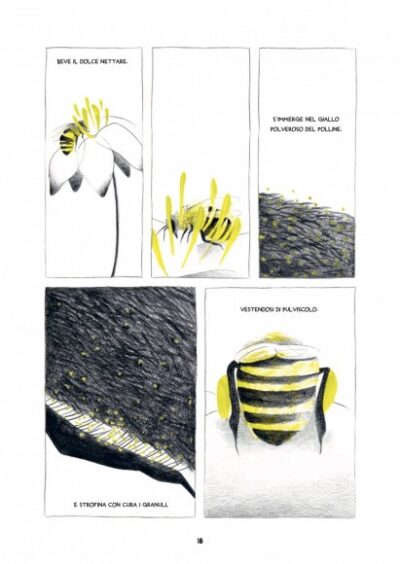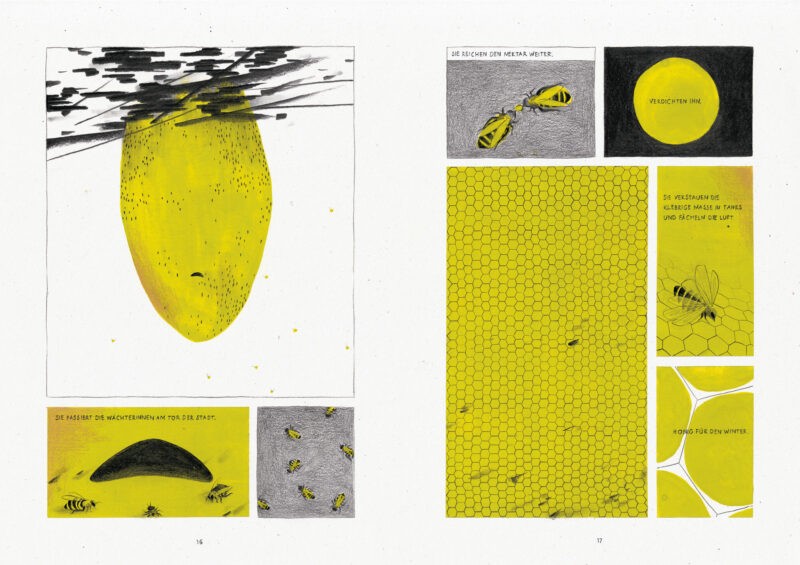 Dovendo familiarizzare con l’argomento, all’inizio ho letto molto e ho confrontato il maggior numero possibile di fonti diverse, dagli studi scientifici ai libri di divulgazione scientifica, dai documentari alle pubblicazioni delle organizzazioni di protezione ambientale. Poi, durante la stesura del testo, ho trovato un po’ di difficoltà a restringere nuovamente l’argomento e a trovare la storia che volevo raccontare tra tutte le informazioni. Mentre facevo ricerche, ho raccolto motivi estetici, ma anche pensieri e sentimenti, che poi ho utilizzato per sviluppare le pagine. Poiché il comportamento degli insetti contiene anche tanta pesantezza e riflessione, non mi sembrava giusto usare la “classica estetica delle api” con esagoni gialli e occhi neri.